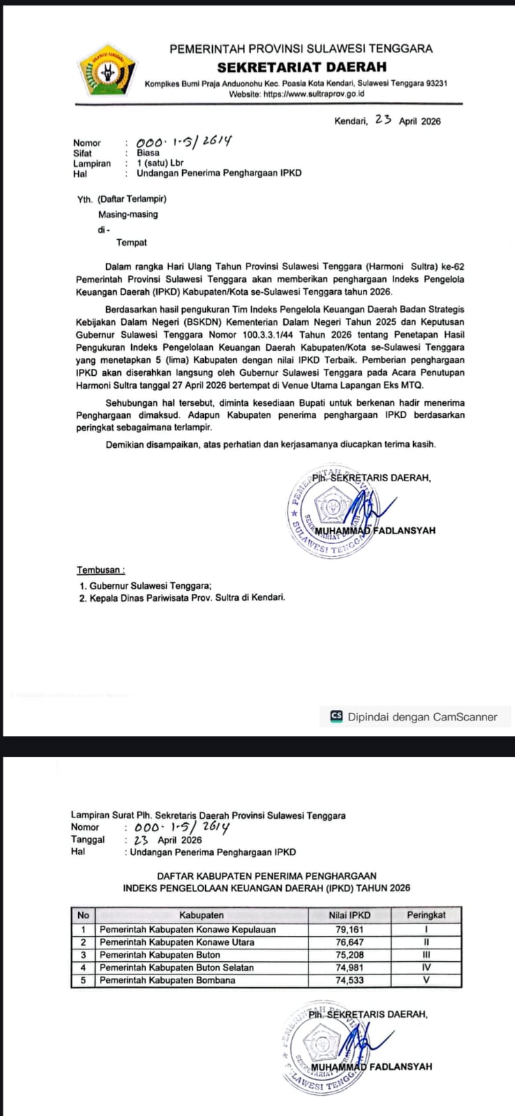 Hal itu merujuk surat Sekretariat Daerah Provinsi Sulawesi Tenggara Nomor 000.1.5/2614 tertanggal 23 April 2026, Konkep menempati posisi pertama dengan nilai 79,161. Raihan tersebut menempatkan Konkep sebagai Kabupaten dengan tata kelola keuangan terbaik di Sulawesi Tenggara (Sultra).